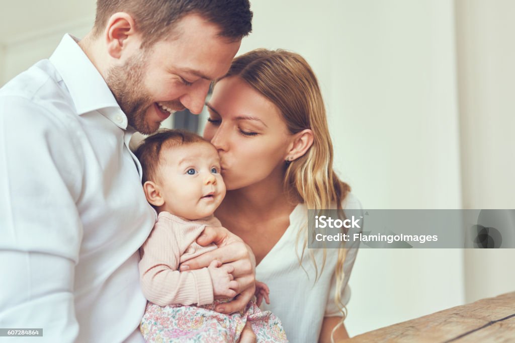 Smiling mother and father holding their newborn baby daughter at home